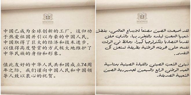 هنأت رئاسة الجمهورية العربية السورية، الشعب الصيني بالعيد الوطني الرابع والسبعين لبلده، منوهة بالتقدم الكبير الذي حققته الصين بفضل شعبها المحب لبلده المحافظ على هويته الوطنية.