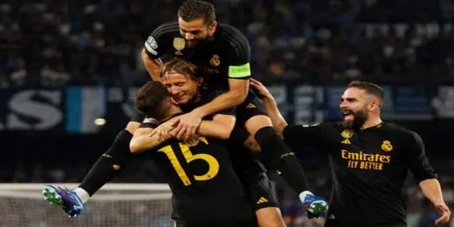 فاز ريال مدريد على نابولي بنتيجة 3/2 ضمن منافسات الجولة الثانية من دور المجموعات لدوري أبطال أوروبا على ملعب “دييجو مارادونا” وسجل لريال مدريد فينيسيوس جونيور وجود بيلينجهام وأليكس ميريت “بالخطأ في مرماه” في الدقائق 27و 34 و78 بينما سجل لنابولي ليو أوستيجارد وزيلينسكي من ركلة جزاء في الدقائق 19 و 54.