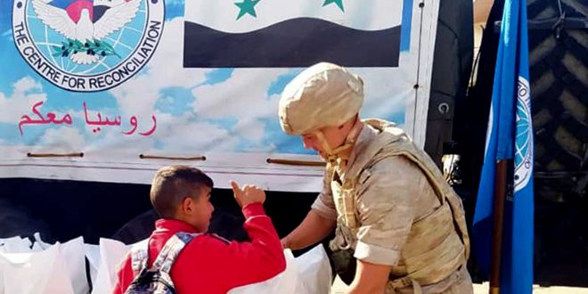 وزع مركز التنسيق الروسي في قاعدة حميميم باللاذقية اليوم دفعة جديدة من المساعدات الغذائية على الأهالي في قرية زاما في منطقة جبلة.