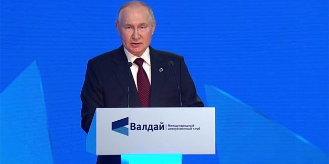 وقال بوتين في كلمة خلال منتدى فالداي الدولي للحوار في منتجع سوتشي: “إن الأساس في هذا العالم الآن هو التوازن، وألا تكون هناك إملاءات من أجل مصلحة القوى المهيمنة، لكن الولايات المتحدة مستمرة في نهج الهيمنة العسكرية والسياسية والاقتصادية”.