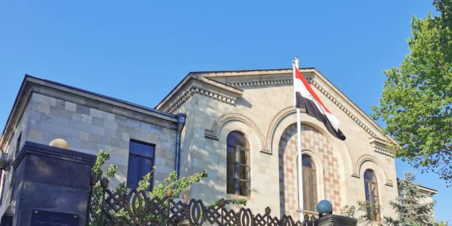 نظمت السفارة السورية في أرمينيا وقفة حداد على أرواح شهداء الاعتداء الإرهابي الذي استهدف حفل تخريج طلاب الكلية الحربية في مدينة حمص.