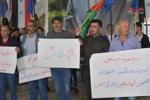 وفي حمص استنكر محمد قربيش رئيس فرع اتحاد الصحفيين في حمص خلال الوقفة التي نفذها فرع الاتحاد في صالة السكك الحديدية بحي المحطة ممارسات العدو الإسرائيلي وما يرتكبه من جرائم إنسانية بحق الشعب الفلسطيني في غزة وقتله الصحفيين في فلسطين وجنوب لبنان، لمنعهم من نقل الحقيقة والمجازر التي يرتكبها هذا العدوان الغاشم للرأي العام العالمي.