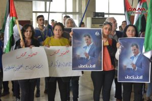بدوره مدير المركز الإذاعي والتلفزيوني الدكتور فاروق شرف لفت إلى أن هذه الوقفة تعبير عن التضامن مع الشعب الفلسطيني الذي يعاني من عشرات السنوات من الاحتلال الإسرائيلي الذي تقف خلفه كل القوى الرجعية والإمبريالية في العالم.