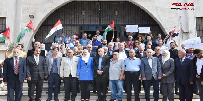 نظم اتحاد الصحفيين في سورية بمختلف فروعه وقفةً تضامنية دعماً لصمود الشعب الفلسطيني، وتنديداً بحرب الإبادة الجماعية التي يشنها العدو الإسرائيلي ضد شعب يدافع عن أرضه وحقوقه ووطنه السليب، واستنكاراً للاستهداف الممنهج الذي يتعرض له الصحفيون ومؤسساتهم الإعلامية في فلسطين المحتلة.