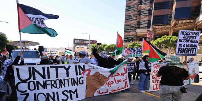 كما تظاهر آلاف الأمريكيين في شوارع ولاية لوس أنجلوس الأمريكية في واحدة من أكبر الاحتجاجات التي شهدتها المدينة، وحملوا لافتات تندد بعدوان الاحتلال وتطالب المجتمع الدولي بتحرك عاجل لوقفه.