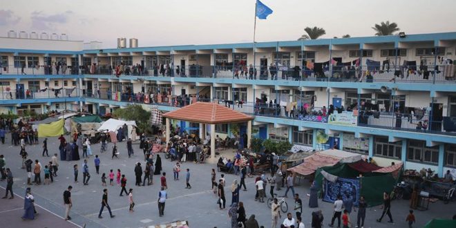 أكثر من 10000 نازح فلسطيني معظمهم من الأطفال والنساء في المركز الواحد من مراكز الإيواء التي أقامتها وكالة الأمم المتحدة لغوث وتشغيل اللاجئين الفلسطينيين (أونروا) في قطاع غزة المحاصر رغم أنه في أفضل حالاته لا يتسع سوى لـ 500 شخص.