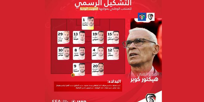 أعلن المدير الفني لمنتخب سورية لكرة القدم هيكتور كوبر التشكيلة التي سيخوض بها منتخبنا مباراته الودية اليوم مع نظيره الكويتي على ملعب شرطة دبي في الإمارات العربية المتحدة.
