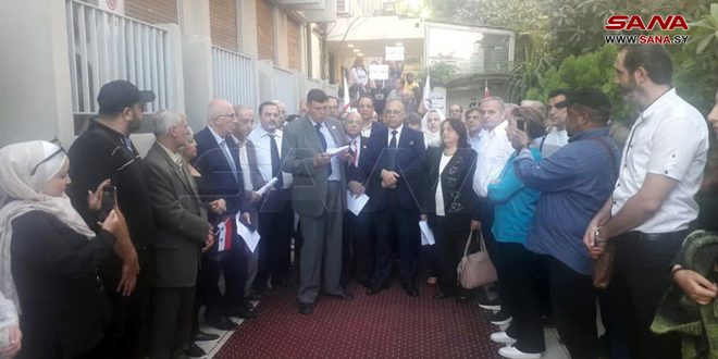 وفي طرطوس أشار رئيس فرع النقابة الدكتور شعبان إسماعيل إلى أن قضية فلسطين قضيتنا وأحد ثوابتنا الوطنية، مندداً بجرائم الاحتلال الذي يسعى لتحقيق أهدافه بفلسطين وبالوطن العربي من القتل والدمار والتخريب وارتكاب المجازر.