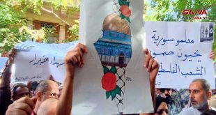 وفي الحسكة، أكد معلمو الحسكة وقوفهم إلى جانب أهالي قطاع غزة مستنكرين العدوان الهمجي للكيان الإسرائيلي الذي يرمي إلى تهجيرهم وتشريدهم بدعم من أميركا والغرب المتصهين.