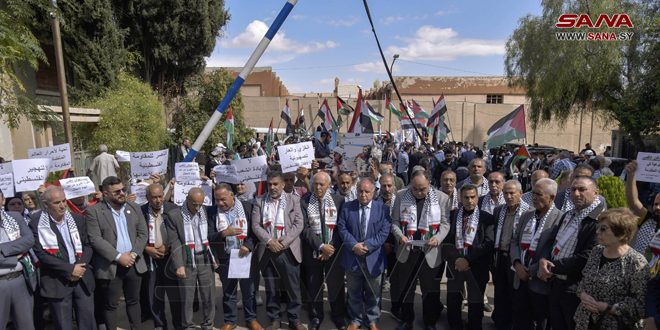نظمت اللجنة الشعبية العربية السورية لدعم الشعب الفلسطيني ومقاومة المشروع الصهيوني بالتعاون مع مؤسسة القدس الدولية- سورية وفصائل المقاومة الفلسطينية اليوم، وقفة تضامنية أمام مقر الأمم المتحدة بدمشق دعماً للشعب الفلسطيني ومقاومته، وتنديداً بالجرائم التي يرتكبها الاحتلال الصهيوني بحق أهالي قطاع غزة المحاصر.