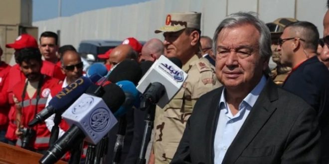 وقال غوتيريش خلال مؤتمر صحفي اليوم من أمام معبر رفح: “إن سكان قطاع غزة يعانون من انعدام الماء والغذاء والوقود والمواد الأساسية، ونحن بحاجة لنقل شاحنات المساعدات من معبر رفح البري بالجانب المصري إلى الجانب الفلسطيني وبأعداد كبيرة، وينبغي الإسراع بذلك”.