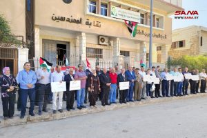 وفي السويداء، أشار رئيس فرع النقابة الدكتور المهندس حسان فهد إلى أن التضامن مع الشعب الفلسطيني واجب وطني، والهدف من الوقفة استنكار ما يقوم به الاحتلال الإسرئيلي من جرائم بحق أهلنا في قطاع غزة.