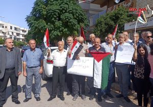 واستنكر الدكتور علي حسن رئيس فرع نقابة الأطباء البيطريين في طرطوس جرائم الاحتلال الصهيوني بحق الأطفال والأبرياء مؤكداً أن هذه الوقفة نصرة لقضيتنا المركزية فلسطين وعاصمتها القدس.