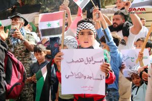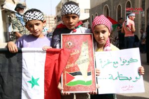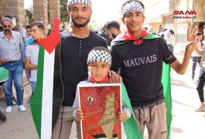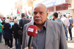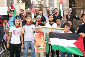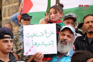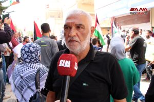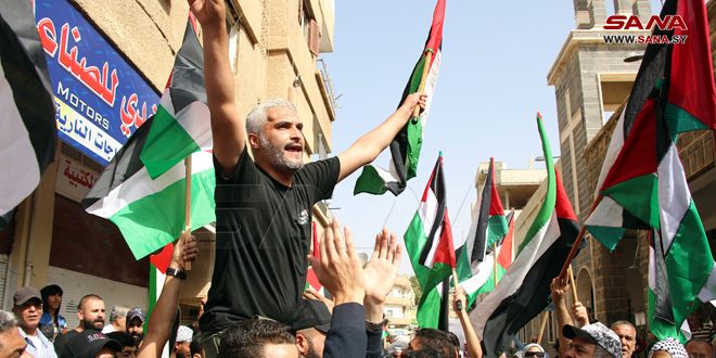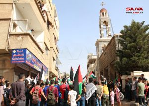 أمين شعبة فلسطين لحزب البعث العربي الاشتراكي في المحافظة حسن الندا أعرب عن التضامن التام مع أهلنا في فلسطين حتى التحرير واستعادة كامل الأرض، فيما اعتبر الأب جريس رزق راعي كنيسة سيدة البشارة للروم الأرثوذكس أن ما يرتكبه كيان الاحتلال بحق أبناء الأرض المقدسة ليس بجديد، ولا سيما المجزرة التي طالت المساجد والكنائس والمشافي والمواطنين الأبرياء، مؤكداً أن المقاومة الفلسطينية قادرة على تغيير التاريخ والانتصار على العدو.