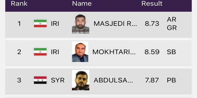 أحرز لاعب منتخب سورية للرياضات الخاصة علاء عبد السلام الميدالية البرونزية في منافسات رمي الكرة الحديدية، ضمن دورة للألعاب الآسيوية البارالمبية المقامة حالياً في الصين.