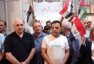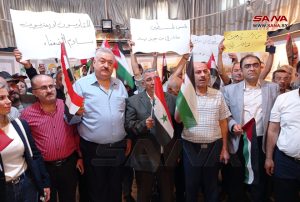 ففي دمشق وخلال الوقفة التي نفذت في صالة الرواق العربي وشارك فيها اتحادا الفنانين التشكيليين السوري والفلسطيني وفروع الاتحاد بدمشق وريفها والقنيطرة، ندد المشاركون بالجرائم التي يرتكبها العدو الصهيوني بحق المدنيين الأبرياء وأفعاله المنافية لحقوق الإنسان والقوانين الدولية بتدمير المدن والمستشفيات واستهداف الكوادر الطبية والإعلامية وكل شرائح المجتمع الفلسطيني.