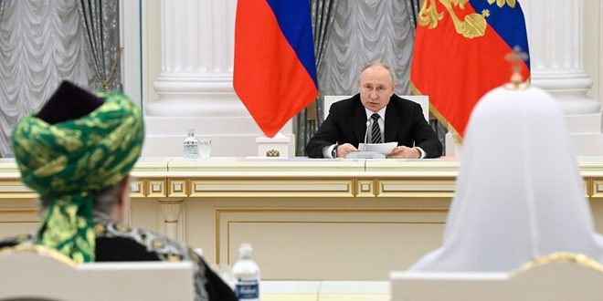 وقال بوتين خلال لقائه رجال الدين في موسكو اليوم: “إن روسيا تراقب الوضع المأساوي في الشرق الأوسط بقلق بالغ وموقفها من الصراع معروف، وتم التعبير عنه بوضوح تام أكثر من مرة، وهو لا ينطلق من باب استغلال الأحداث المأساوية الراهنة في الأراضي الفلسطينية، وإنما يستند إلى قرارات مجلس الأمن الدولي التي تنص على حل الدولتين”.
