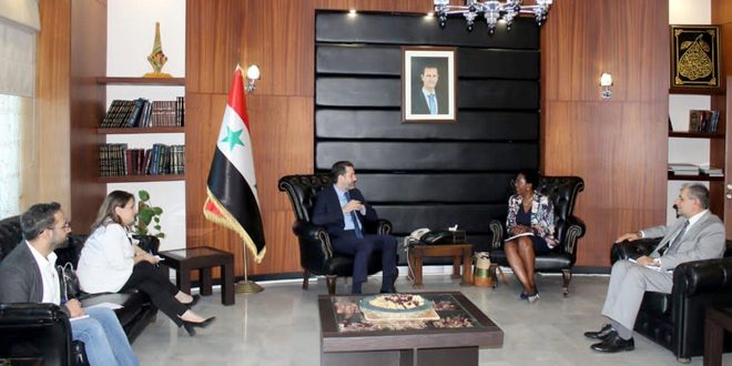 بحث وزير الشؤون الاجتماعية والعمل لؤي المنجد مع ممثل صندوق الأمم المتحدة للسكان في سورية مورييل مافيكو والوفد المرافق لها مجالات التعاون المشتركة وسبل تطويرها، بما يعود بالفائدة على المناطق المستهدفة.