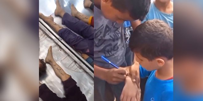 خوفاً من الارتقاء كضحايا مجهولي الهوية للعدوان الإسرائيلي المتواصل يصطف أطفال غزة وأهاليهم في طوابير طويلة داخل المشافي ليكتبوا أسماءهم على أياديهم وأجسادهم في صورة تجسد وفقاً لموقع غلوبال ريسيرتش الكندي فظاعة الجرائم والمجازر التي ترتكبها “إسرائيل”.