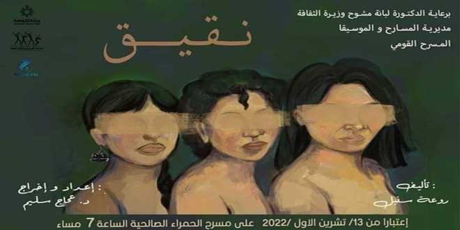 وعرض “نقيق” على خشبة مسرح الحمراء بدمشق العام الماضي حيث أخرجه عجاج سليم وهو من تمثيل ريم زينو وندى عبدالله ووليد الدبس وآليس رشيد وإيناس رشيد الذين اجتمعوا ليرووا القصة على لسان سيدة فقدت ولدها الوحيد وكذلك هاجر زوجها بحثاً عن عمل لتكون إصابتها بالشلل مفترق طريق في حياتها حيث زرع في نفسها ألماً تحول إلى هلوسة وهواجس.