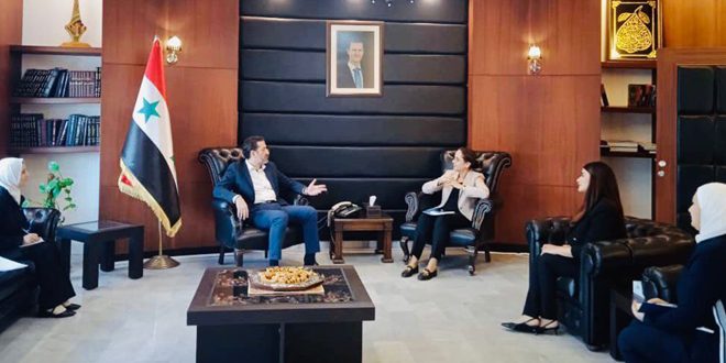 بحث وزير الشؤون الاجتماعية والعمل لؤي المنجد اليوم مع ممثلة منظمة الصحة العالمية في سورية الدكتورة إيمان الشنقيطي والوفد المرافق لها آليات التعاون المشتركة بين المنظمة والمنظمات غير الحكومية العاملة في القطاع الصحي وسبل تطويرها واستدامتها، بما ينعكس بالفائدة الصحية على الفئات المحتاجة.