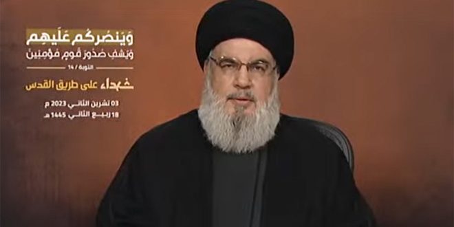 ولفت السيد نصر الله إلى أن المعركة في غزة اليوم فاصلة وحاسمة وما بعدها ليس كما قبلها، ويجب على كل حر في العالم تحمل المسؤولية تجاه غزة وعلى جميع الدول العربية أن تعمل كل ما بوسعها لوقف العدوان الإسرائيلي وأن تنتصر المقاومة في غزة لأن هذا الانتصار مصلحة وطنية لجميع الدول العربية، مبيناً أن معركة طوفان الأقصى أًصبحت ممتدة في أكثر من جبهة وساحة، وأن قرار المقاومة في العراق واليمن الدخول في قلب المعركة حكيم ومهم، كما أن قرار المقاومة العراقية استهداف قواعد الاحتلال الأميركية في العراق وسورية صائب وشجاع.