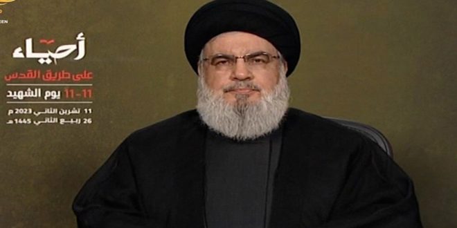 أكد الأمين العام لحزب الله السيد حسن نصر الله أن سورية رغم ظروفها الصعبة في موقعها الصامد مستمرة بدعم المقاومة والمقاومين، رغم أنها تتعرض لحرب كونية وتقاتل تنظيم /داعش/ الإرهابي المدعوم من الولايات المتحدة.