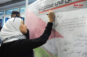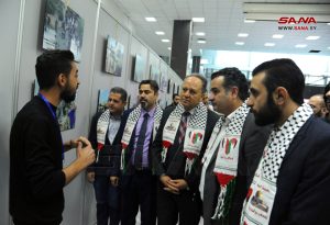 وتحدث رئيس مكتب التعليم العالي وقضايا الطلبة المركزي في الاتحاد الوطني لطلبة سورية عماد العمر إن المعرض يوثق الجرائم الممنهجة للاحتلال من تدمير وبناء مستوطنات وحصار جائر على الشعب الفلسطيني في الغذاء والدواء وكل الاحتياجات ومستلزمات الحياة، معتبراً أن المعرض هو أحد أشكال التضامن مع أهلنا في قطاع غزة.