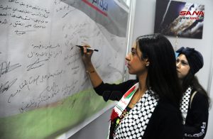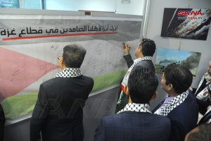 من جانبه أكد قاسم العلي رئيس فرع جامعة دمشق لاتحاد الطلبة أن المعرض يعبر عن الصورة الحقيقية للاحتلال الذي يستهدف المستشفيات ويحاصرها ويقطع الوقود والإمدادات الغذائية وكل سبل الحياة عن الشعب الفلسطيني، ويقدم رسالة تأييد ودعم لأهلنا في غزة من خلال 92 لوحة مشاركة.