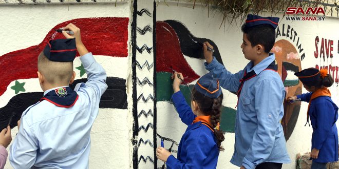 عبّر أطفال مدرسة عكرمة المخزومي ومدرسيها اليوم عن تضامنهم مع فلسطين وألمهم على الأطفال الشهداء فيها وعلى شهداء الكلية الحربية في حمص عبر مجموعة من الرسومات على جدران المدرسة.