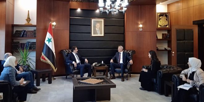 بحث وزير الشؤون الاجتماعية والعمل لؤي المنجد مع الممثل والمدير القطري لبرنامج الغذاء العالمي في سورية كينيث راي كروسلي مجالات التعاون القائمة وآلية تطويرها.