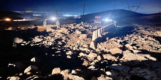 أعلنت وزارة الداخلية عن تحويل حركة السير على أوتستراد دمشق – حمص ذهاباً وإياباً جراء انهيار جزء من الجبل بمحلة الثنايا، حيث أدى هطول الأمطار إلى انهيار جزء من جبل ترابي على أوتستراد دمشق _ حمص وذلك بمحلة الثنايا، ما أدى لقطع أوتستراد (دمشق – حمص ) ذهاباً وإياباً.