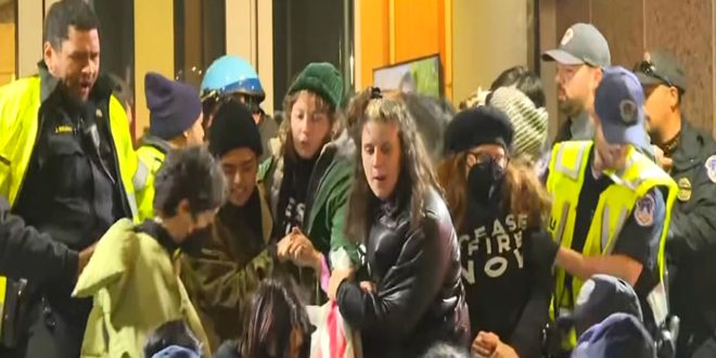 قمعت الشرطة الأمريكية عشرات المتظاهرين الذين تجمعوا خارج مقر اللجنة الوطنية الديمقراطية في مبنى الكونغرس بالعاصمة واشنطن للمطالبة بوقف العدوان الإسرائيلي على قطاع غزة.