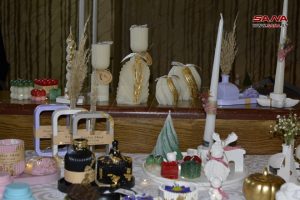 وشاركت الشابة سيرين الطباع بمجموعة منوعة من المشغولات اليدوية فيها رسم وخط عربي وإكسسوارات وريزين وورود منوعة، فيما قدمت نسرين الكردي أشكالاً منوعة من الشموع المعطرة بعدة أحجام.