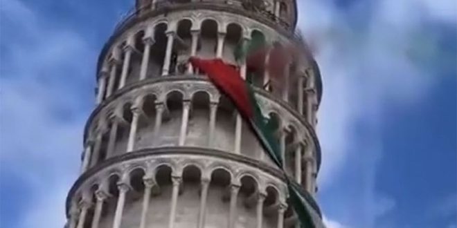 وانتشر عبر منصات التواصل الاجتماعي المختلفة مقطع فيديو يظهر العلم الفلسطيني وهو يرفرف على مبنى برج بيزا، والألعاب النارية الملونة بألوان العلم الفلسطيني، وذلك في واحدة من أكبر المدن الأوروبية التي تشهد مظاهرات يومية مناهضة للحرب الشرسة التي يشنها الكيان الإسرائيلي المحتل على قطاع غزة المحاصر.