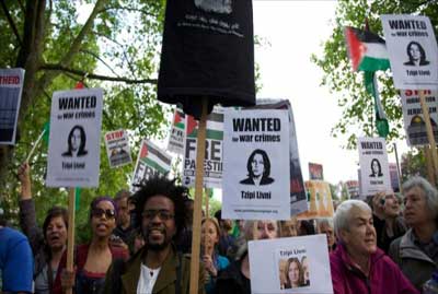 شهدت لندن أمس مظاهرات غضب واحتجاج على زيارة وزيرة العدل في حكومة الاحتلال الإسرائيلي تسيبي ليفني للعاصمة البريطانية طالب المشاركون فيها باعتقالها وعبروا عن تضامنهم مع حقوق الشعب الفلسطيني المشروعة في ذكرى نكبة فلسطين.