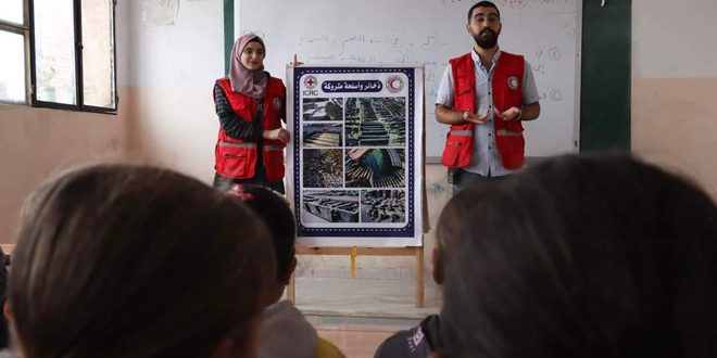 يعمل فرع الهلال الأحمر العربي السوري في درعا على نشر التوعية بين الأهالي للحذر من خطر مخلفات الحرب الإرهابية على سورية، وذلك عبر ندوات ومنشورات ولقاءات مع الأهالي وطلاب وتلاميذ المدارس وغيرهم من فئات المجتمع المحلي في المحافظة.