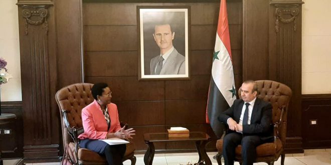 بحث وزير الإدارة المحلية والبيئة المهندس حسين مخلوف مع موريل مافيكو الممثل الجديد لصندوق الأمم المتحدة للسكان في سورية والوفد المرافق لها آليات العمل المشترك مع الصندوق، والتنسيق لإنجاح المشاريع القائمة وإيجاد فرص لتنفيذ مشاريع جديدة، وخاصة ما يتعلق منها بدعم سبل العيش وإمكانية تنفيذ مشاريع لدعم وتمكين المرأة والشباب في المناطق المتضررة بالزلزال.
