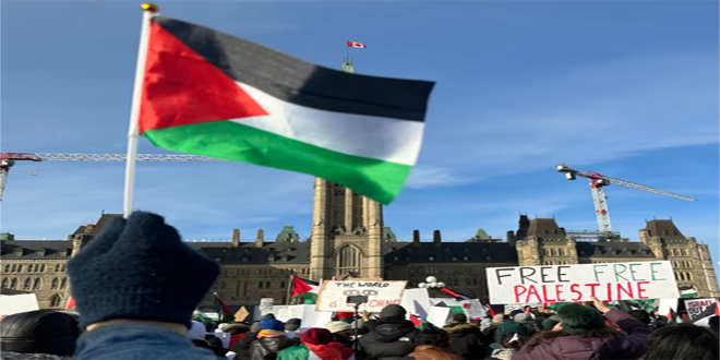 تجمع آلاف المتظاهرين أمام مبنى البرلمان الكندي في العاصمة أوتاوا ملوحين بالأعلام الفلسطينية، ومطالبين بوقف العدوان الإسرائيلي على قطاع غزة.