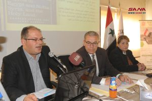 الدكتور حسام غازي أستاذ علم الآثار في جامعة دمشق تحدث في عرضه عن الرواية التوراتية وأزمة الهوية الإسرائيلية، وبين أن هناك توظيفاً سياسياً كبيراً لهذه الرواية لتبرير وجود الكيان الصهيوني على أرض فلسطين والجولان السوري المحتل.