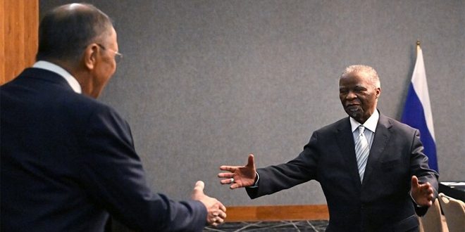بحث وزير الخارجية الروسي سيرغي لافروف مع رئيس جنوب إفريقيا السابق ثابو مبيكي الوضع في أوكرانيا والصراع الفلسطيني الإسرائيلي وتعزيز العلاقات بين البلدين.