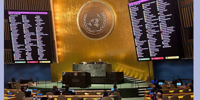 وصوتت لمصلحة مشروع القرار المعنون “الجولان السوري” 91 دولة مقابل رفض كيان الاحتلال و7 دول، في حين امتنعت 62 دولة عن التصويت.