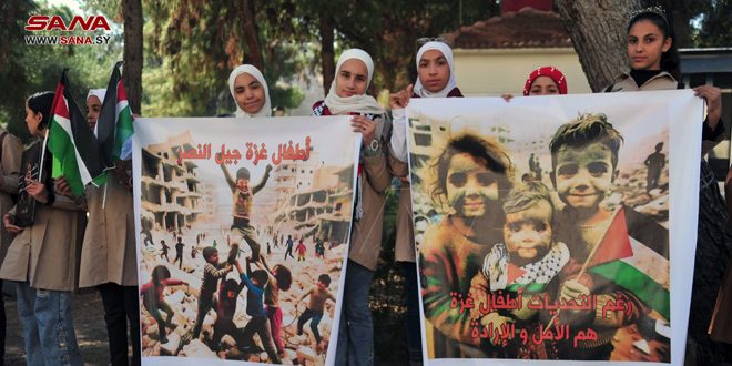 وتم خلال الوقفة رفع الأعلام الوطنية السورية والفلسطينية وصور لشهداء أطفال طالتهم يد الإجرام الإسرائيلي، إضافة إلى عرض مشاهد تمثيلية لقصف الاحتلال المتعمد للمشافي والمدارس بمن فيها، وكل البنى التحتية في القطاع المحاصر.