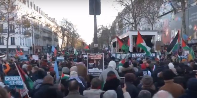 تظاهر ألاف الفرنسيين اليوم وسط العاصمة باريس دعماً للشعب الفلسطيني، وتنديداً بالعدوان الإسرائيلي المتواصل على قطاع غزة المحاصر.
