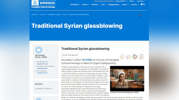 وقالت المنظمة على موقعها الإلكتروني إنه تم أُدراج نفخ الزجاج السوري التقليدي في عام 2023 على قائمة التراث الثقافي اللامادي الذي يحتاج إلى صون عاجل.