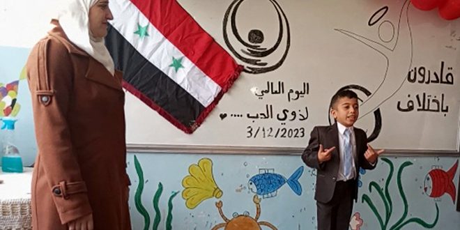 مدير التربية بحلب المهندس مصطفى عبد الغني أوضح في تصريح لمراسلة سانا حرص المديرية على تقديم الدعم للتلاميذ ذوي الإعاقة، من خلال تخصيص غرف للمصادر في المدارس وتأمين الكوادر التربوية المؤهلة لتدريسهم، والعمل على دمجهم، مشيراً إلى أن الاحتفال باليوم العالمي لذوي الإعاقة في جميع المدارس الدامجة بهدف تسليط الضوء عليهم وتعزيز ثقتهم بأنفسهم، إضافة إلى مشاركتهم أقرانهم الأسوياء في النشاطات لتحقيق ثقافة الدمج.