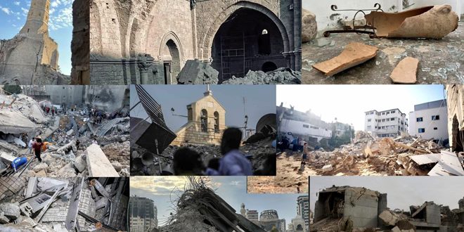 طيران الاحتلال دمر المسجد العمري الكبير أحد أهم وأقدم مساجد فلسطين، حيث يعود تاريخ إنشائه إلى أكثر من 3 آلاف عام، وكنيسة القديس برفيريوس في حي الزيتون وهي من بين أقدم الكنائس في العالم، ويعود تاريخ بنائها إلى عام 425 ميلادي، قبل أن يتم تجديدها عام 1856، والكنيسة البيزنطية التي يزيد عمرها على 1600 عام، إذ تعود إلى عام 444 ميلادي، إلى جانب متحف رفح الذي يعد مقصداً لدارسي تاريخ القطاع وتراثه، كما دمر 9 دور نشر ومكتبات، و6 مراكز ثقافية وألحق أضراراً بـ 15أخرى.