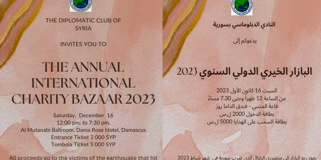 بمشاركة 16 دولة يقيم النادي الدبلوماسي في سورية بالتعاون مع وزارتي الخارجية والمغتربين والشؤون الاجتماعية والعمل، البازار الدولي الخيري السنوي لعام 2023، وذلك يوم غد السبت بفندق الداما روز بدمشق.