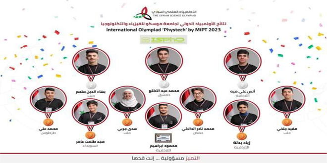 أحرز طلاب الأولمبياد العلمي السوري والمركز الوطني للمتميزين 3 ميداليات فضية و 6 ميداليات برونزية وشهادة تقدير في الأولمبياد الدولي لجامعة موسكو للفيزياء والتكنولوجيا لعام 2023 والذي تم تنظيمه في الخامس من شهر كانون الأول الجاري بمشاركة 86 طالباً وطالبة من 24 دولة.