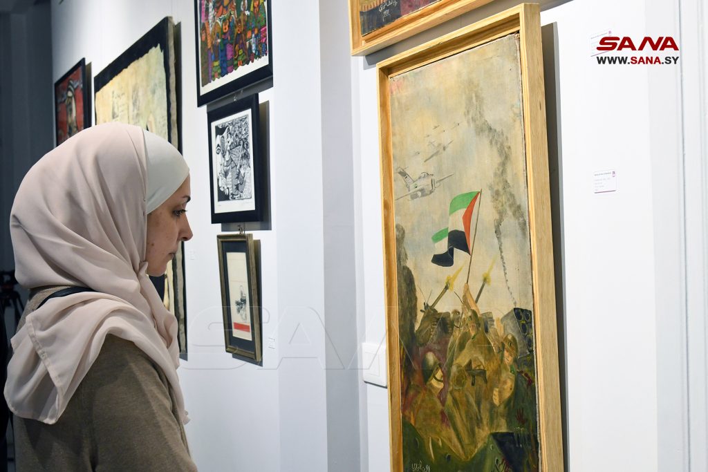 وتوسط صالة العرض لوحة كتب عليها “كانت القضية الفلسطينية ولا تزال موضوعاً رئيساً في إبداعات الفنان التشكيلي العربي عموماً والفلسطيني خصوصاً والتي ترجمها بكثير من الصدق النبيل بأشكال وصيغ ورموز مختلفة تنسجم مع رؤاه ورؤيته ما حوّلها إلى أيقونة فنه وإبداعه وجزء أساس من وجدانه”.